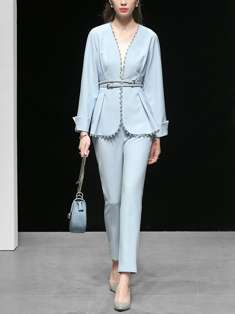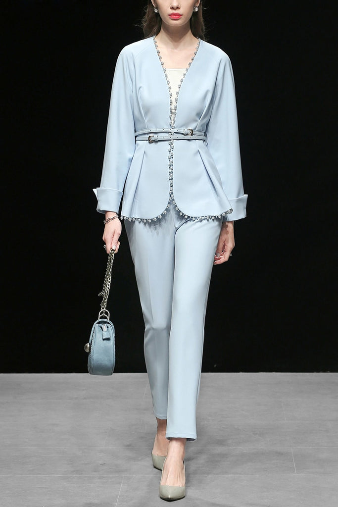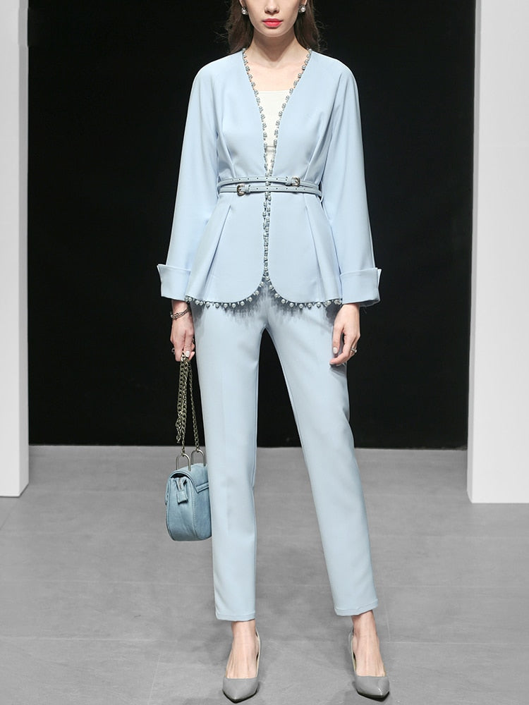 2019 Women Fashion Pants Set Elegant Patchwork Ribbed Beading Embellished Coat Belted and Ankle Length Pencil Skinny Pants C9025