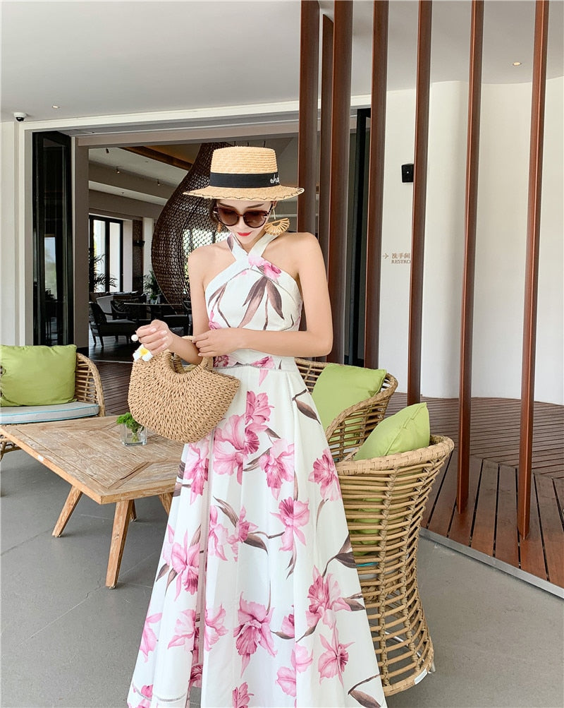 Summer Holiday Long Dress 2019 Runway Women Sexy Backless Hollow Out Maxi Dress Slim Halter Beach Party Dress