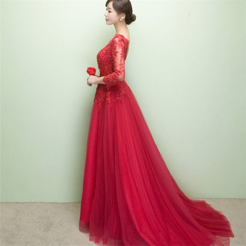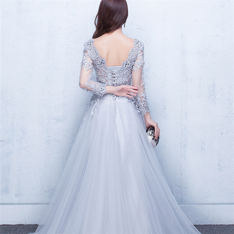 It's Yiiya New Three Quarter Illusion Backless Lace Up Flowers Elegant Evening Dress Floor Length Party Gown Evening Gowns LX048