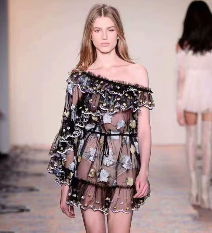 Runway Designer Mesh Holiday Summer Dress Sexy Women One Shoulder Ruffles Floral Embroidery Dress Lady Short Dress