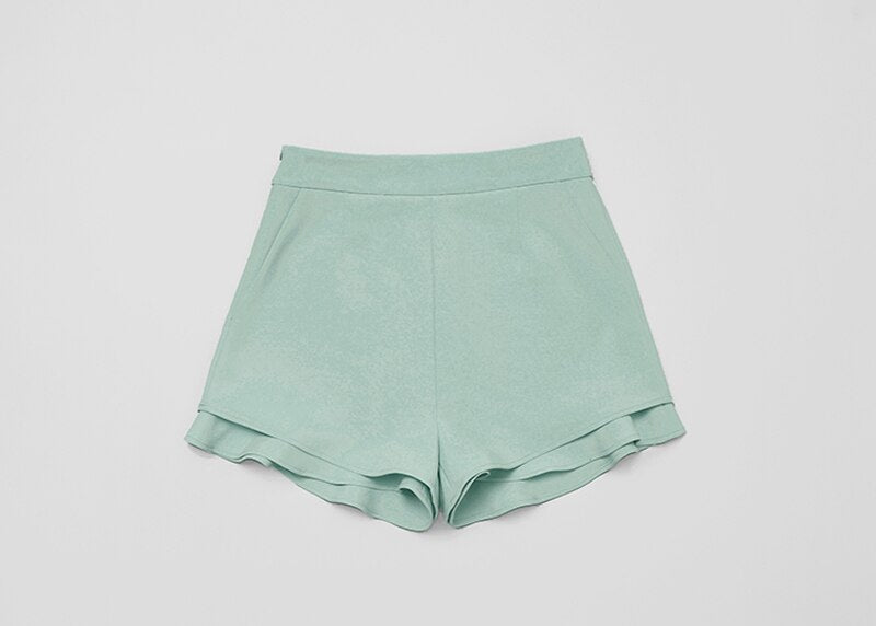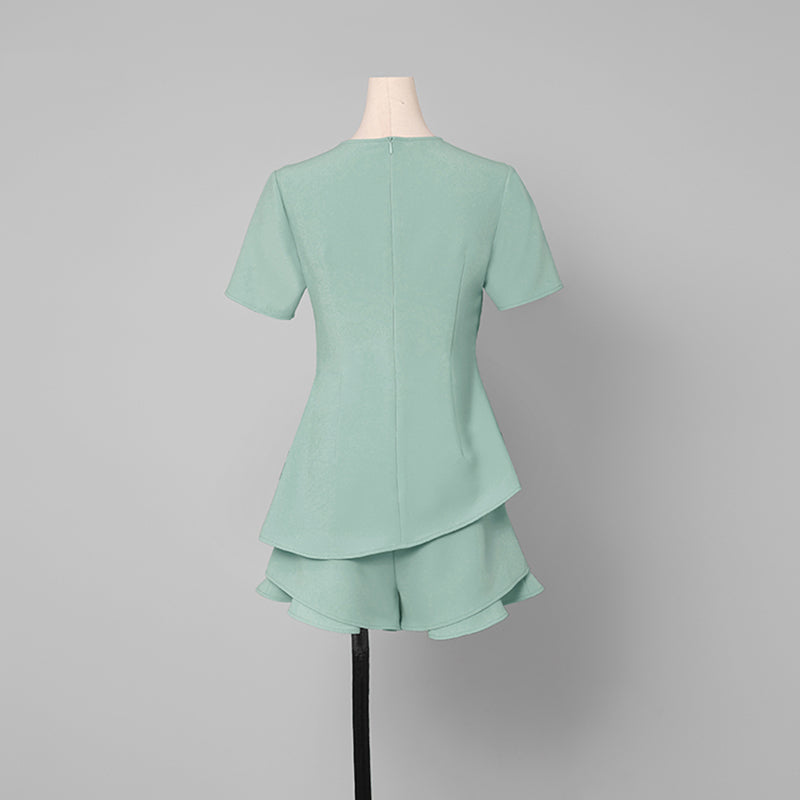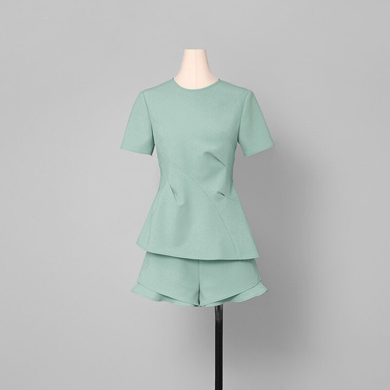 Simple Design Women Two Pieces Sets O Neck Solid Color Short Sleeve Wrinkle Office Lady Blouse Top Short Ruffle Pants Z1359